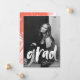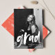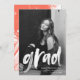 Tarjeta de agradecimiento para graduación moderna que presenta la foto del graduado con "grad" en un guión de pincel blanco. Personalice la parte delantera de la tarjeta de agradecimiento de graduación agregando el nombre del graduado, la escuela, el nombre y el año de graduación. En la parte posterior de la tarjeta hay espacio para el mensaje escrito a mano o con tipeado con un fondo de pinceladas de coral pintadas.