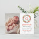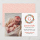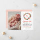 Esta caprichosa tarjeta de anuncio de nacimiento con foto presenta a su bebé niña con una foto de recién nacida junto a una colorida corona floral de acuarela con la inicial de un monograma coral. El nombre en letra script, los detalles del nacimiento y un mensaje de "Bienvenida con amor" completan la parte delantera. La corona presenta flores de acuarela y follaje en rosa claro, amarillo dorado, naranja coral y verde. Un patrón de lunares en rosa claro coordinado adorna la parte trasera. Todo el texto es totalmente personalizable.