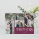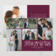 Tarjeta de invitación de boda antigua y elegante con un texto tipográfico mezclado con guiones y fuentes serif que dice "Newlyweds" con una divertida cuadrícula fotográfica. El fondo es arándano.