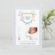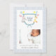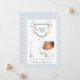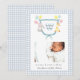 Adorable crest monogramado con acuarela con animales con un borde de gingham azul pálido y blanco Anuncio de nacimiento para bebé niño.