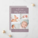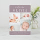 Los elegantes anuncios de natalidad incluyen cuatro fotos de recién nacidos dispuestas en un collage de rejilla sobre un polvoriento fondo de lavanda morado. "Welcome [name]" aparece en la parte superior del guión de caligrafía de moda y de las letras de bloques clásicas. Personalice con el nombre completo del bebé, estadísticas de nacimiento y una firma familiar en la parte inferior.