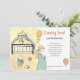 Esta adorable y caprichosa madre para ser invitación de embarazo de un bebé presenta un lindo verso y una esperada madre con animales rellenos esperando en el vivero la llegada del bebé. Hues de melocotón y sepia sobre blanco. Conejo con patrón de globo en el reverso de la tarjeta. El texto dice: "Laura y Jamie esperan un hijo. Mamá ha estado juntando cosas una por una. Los juguetes esperan pacientemente para que se jueguen pronto, ¡y papá está realmente sobre la luna! ¡El bebé llega en noviembre!" Puede usar este texto o escribir su propio verso de rima corto. Añade tus nombres al texto.