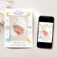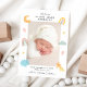 Celebra tu nueva llegada con este caprichoso anuncio de la foto del nacimiento en las nubes, arcoiris y estrellas. Este dulce diseño presenta la foto vertical de su bebé rodeada de divertidos ilustraciones acuarelas de nubes sonrientes, arcos coloridos, una luna creciente, una estrella fugaz y corazones rosas sobre un fondo blanco. La parte posterior se deja en blanco, lo que la convierte en perfecta para notas manuscritas o un acabado minimalista. Una elección encantadora y sin distinción de género para los niños y niñas.