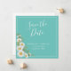 Bonito El anuncio de Save the Date incluye una esquina de mareas blancas de color sobre fondo verde azulado claro con bloques de texto de personalizable blanco en fuentes modernas. Agregar código QR personalizado y otra información en la parte posterior.
