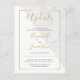Haga saber a sus amigos y familiares sobre el cambio de planes con estas elegantes tarjetas de anuncio de "Actualización". Ya sea que esté posponiendo su boda y no sepa la nueva fecha o sepa la nueva fecha y desee hacérselo saber lo antes posible, puede personalizar fácilmente estas tarjetas para hacer justo eso. Con un borde de falso foil dorado con fondo blanco y mármol y una tipografía de escritura y serif elegante.