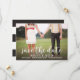 Anuncio de antemano de fecha de boda caprichoso y elegante con foto que presenta escritura de caligrafía moderna blanca y parte posterior con patrón de rayas
