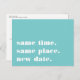 ¿Necesitas posponer o reprogramar tu boda? Haz que tus invitados se enteren con estas tarjetas postales modernas y divertidas en aqua vibrante con letras blancas crujientes. El diseño basado en tipografía divertida y astuta presenta "mismo lugar, misma hora, nueva fecha" en la parte delantera, con la nueva fecha de la boda y detalles en la parte posterior.