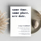 ¿Necesitas posponer o reprogramar tu boda? Hazlo saber a tus invitados con estas tarjetas modernas y divertidas en blanco con letras en azul marino intenso. El diseño tipográfico divertido y astuto presenta "mismo lugar, misma hora, nueva fecha" en la parte superior con la nueva fecha de la boda y detalles debajo.