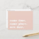 ¿Necesitas posponer o reprogramar tu boda? Haz saber a tus invitados con estas tarjetas postales modernas y divertidas en rosa rubor chic con letra blanca crujiente. La divertida y astuta tipografía presenta "mismo momento, mismo lugar, nueva fecha" en la parte delantera, con la nueva fecha de la boda y detalles en el reverso.