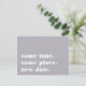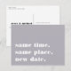 ¿Necesitas posponer o reprogramar tu boda? Haz que tus invitados se enteren con estas tarjetas postales modernas y divertidas en gris elegante con letras blancas crujientes. El diseño basado en tipografía divertida y astuta presenta "mismo lugar, misma hora, nueva fecha" en la parte delantera, con la nueva fecha de la boda y detalles en la parte posterior.