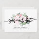 Este diseño presenta un arreglo floral de acuarela rosa suave detrás de las palabras "guarda la fecha" en negrita y letra manuscrita. Los nombres de la pareja y los detalles de la boda se muestran a continuación y se pueden personalizar. Gráficos ©Crea El Corte