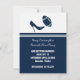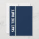 Anuncio de Save the Date de boda de fútbol divertido hecho en azul oscuro, azul pizarra y blanco. Los gráficos de un zapato de tacón alto azul stiletto pateando un balón de fútbol azul decoran la parte superior blanca de la tarjeta. La parte inferior de la tarjeta está hecha en azul oscuro con una franja azul pizarra cerca de la parte superior, y texto blanco personalizado listo para personalizar con la información de su boda. Una parte posterior azul tiene texto blanco que corre de lado y dice Save The Date. Excelentes anuncios de Save The Date para la pareja fanática del fútbol.