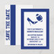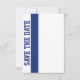 Anuncio divertido de boda de fútbol "Save the Date" hecho con un marco de color azul federal alrededor de un área de texto blanca. Gráficos de un tacón alto pateando un balón de fútbol azul y blanco decoran la parte superior de la tarjeta, con texto azul debajo. La parte trasera está hecha en blanco con una franja vertical azul y "Save The Date" en letras azules negritas que corren verticalmente. Personalice todo el texto según sus necesidades. Excelentes anuncios de "Save The Date" para la pareja fanática del fútbol.
