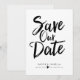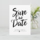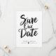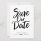 Este diseño presenta las palabras "save the date" en negrita y en guión manuscrito negro. Los nombres de la pareja y los detalles de la boda se muestran a continuación y se pueden personalizar.