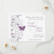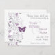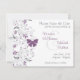 Este elegante y romántico diseño de invitación de "save the date" presenta una rama gris con flores púrpuras y una mariposa púrpura. El texto está en gris con los nombres de la novia y el novio en un color púrpura que combina con la mariposa y las flores. (Este púrpura también podría llamarse orquídea, violeta o uva). Esto sería ideal para una boda de finales de verano u otoño o podría personalizarse en una invitación para una fiesta de aniversario o una ducha de novia.