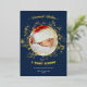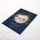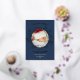 Una plantilla moderna y dulce de tarjeta de vacaciones para anunciar el nacimiento de un bebé con un tema de fiestas invernales, que incluye un marco botánico invernal caprichoso y dibujado a mano con lámina de oro real, caligrafía moderna y tipografía para el título: "Los deseos más cálidos y besos del bebé" con lámina de oro real también, sobre un fondo azul marino. Plantillas para dos fotos.