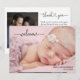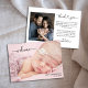 Un sencillo anuncio de nacimiento que incluye la foto de su recién nacido con una superposición de "bienvenida" en una elegante escritura blanca. Solo tiene que añadir el nombre de su bebé y la fecha de nacimiento. La parte posterior, con su elegante "gracias", es el lugar perfecto para un mensaje personalizado y otra foto. Simplemente haga clic en el botón editar / personalizar para personalizar este diseño.