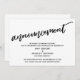 La distinción de esta suite se debe a la fuente moderna de escritura a mano utilizada para las frases de acento. En el caso de que necesite informar a sus invitados que su boda ha sido cancelada, esta tarjeta ofrece una opción audaz y llamativa. En esta pieza, se utilizó la fuente de escritura a mano para crear un gráfico simple que representa la palabra "anuncio". Utilice los campos de la plantilla para agregar sus datos personales y hacer que este diseño moderno y único sea suyo. El fondo blanco se puede cambiar a cualquier color que prefiera. Por favor, comuníquese con nosotros para cualquier solicitud especial o para obtener ayuda para personalizar. // 100 //