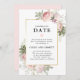 Las rosas y las flores de hortensia rosadas desvanecidas rústicas decoran esta plantilla de evento pospuesto. Las flores están enclavadas en flores verdes de salvia que decoran un marco dorado. La parte posterior de la plantilla de evento pospuesto es un suave rosa desvanecido.