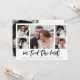 Este simple anuncio de boda en blanco y negro presenta una tipografía moderna e informal que dice "nos casamos", con una cuadrícula de varias fotos de cinco fotos en la parte delantera y una más en la parte trasera. Una forma elegante de informar a amigos y familiares sobre su fuga o que se acaba de casar.