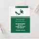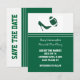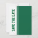 Anuncio divertido de boda de fútbol "Save the Date" hecho en verde cazador y blanco. Gráficos de un elegante zapato verde de tacón alto pateando un balón de fútbol verde y blanco decoran la parte superior blanca de la tarjeta. La parte inferior de la tarjeta es verde, con texto blanco personalizable con la información de su boda. La parte posterior verde y blanca tiene texto verde que corre de lado y dice "Save The Date". Excelentes anuncios de "Save The Date" para la pareja fanática del fútbol.