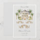 El anuncio de guardar la fecha presenta una villa de mansión rodeada de palmeras sobre un fondo gris.