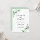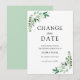 Debido a eventos recientes o circunstancias imprevistas, es posible que deba posponer su boda. Envíe estas tarjetas a sus invitados para informarles sobre el cambio de fecha. Con las palabras "cambiar la fecha" en caligrafía, rodeadas de un marco de follaje y flores blancas.