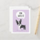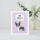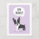 Tarjetas postales de anuncio de cambio de dirección con una ilustración de dibujos animados de un pequeño perro Boston Terrier en un fondo púrpura claro. Texto en burbuja de diálogo "¡Nueva dirección!". Agregue su nueva dirección en la parte posterior. El texto en la parte posterior es personalizable.