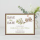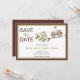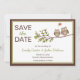 Tarjetas de invitación caprichosas para guardar la fecha con dos búhos lindos sentados en una rama con un corazón en una burbuja de diálogo encima de ellos. Borde marrón y verde sobre fondo blanco. Personalizado con su información en el espacio proporcionado. Obtenga los sellos de búhos para guardar la fecha a continuación:
