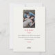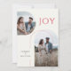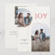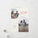 Estas tarjetas de felicitación planas de 5" x 7" tienen espacios para tres fotos, dos nombres, año y un mensaje. La parte frontal tiene dos fotos arqueadas, una vertical y otra horizontal. La felicitación es "Alegría," en letras rojas. El fondo es marfil. La parte trasera tiene una foto vertical. El mensaje personalizable dice, "Estamos emocionados de anunciar que nos comprometimos, y ambos les deseamos paz y alegría durante las fiestas y en el año que viene."