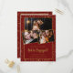 La confeti dorado decora el fondo rojo burgundy tanto en la parte delantera como trasera. Tres fotografías de la pareja se presentan en la parte delantera. Todo el texto a continuación, incluyendo el gran Estamos comprometidos, se puede editar para personalizar su anuncio de compromiso único.