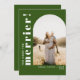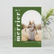 Una tarjeta de anuncio de embarazo de vacaciones tipográfica divertida que incluye su foto de embarazo favorita en forma de arco y "¡cuantos más, mejor!" en letra blanca sobre fondo verde. Puede agregar un mensaje opcional al reverso.