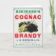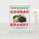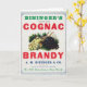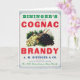 Clusters de uvas moradas y verdes y viñas de uva rodeados de texto y de un borde de rollos publicitando el coñac brandy de Bininger.