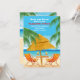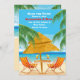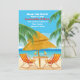 ¡El anuncio perfecto para guardar la fecha de una boda en un destino de playa! El diseño presenta una escena de playa con palmeras, una sombrilla de paja, sillas de arena y cócteles para dos en colores brillantes. La tarjeta es fácil de personalizar con su redacción, fuente, color de fuente y elección de seis tipos de papel.