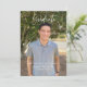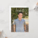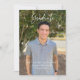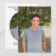 Una tarjeta de anuncio de graduación de foto de graduado con fuente de letra script moderna, foto de retrato con sangrado total en la parte frontal con nombre, información de la clase y detalles de la escuela. La parte posterior tiene una segunda foto con detalles adicionales.