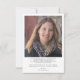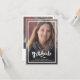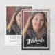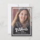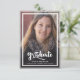 Un anuncio de graduación con un script moderno, audaz y elegante con dos fotos. Con una foto de tamaño completo en la parte frontal con texto superpuesto en blanco y una foto en el reverso con detalles opcionales.