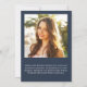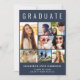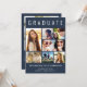 Elegante anuncio de graduación azul oscuro para celebrar al graduado con "GRADUADO" en la parte superior en tipografía blanca grande, un collage de siete fotos y su nombre, año de graduación y escuela en tipografía blanca moderna. En la parte posterior, agregue una foto adicional y un mensaje personalizado.
