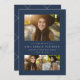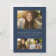 Celebre a su graduado con este anuncio de graduación clásico y simple de tres fotos. El collage con tipografía simple es perfecto para mostrar las fotos de último año. El tipo incluye mucho espacio para el nombre, la escuela y el año, y el fondo azul marino coincide con la parte posterior de la tarjeta. El color azul marino se puede ajustar a cualquier color de la escuela haciendo clic en "Personalizar más".