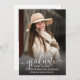 Tarjeta de anuncio de graduación simple con foto de graduado con fuente de guión con foto de retrato de sangrado completo en la parte frontal con nombre y detalles de graduación. La parte posterior tiene una segunda foto con detalles adicionales. Haga clic en el botón de edición para personalizar este diseño.