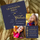 Elegante y con clase tono azul y dorado cuadrado, diseño de anuncio de graduación de dos fotos y invitación a fiesta. Cuenta con la palabra "Graduado" en arte de texto en tono dorado con escritura y el año "2026" en arte de texto vertical en tono dorado en la parte frontal con tus fotos en esquinas opuestas. Se proporcionan campos para el nombre del graduado, fecha de graduación, escuela, colegio o universidad y planes futuros en la parte frontal. En la parte posterior hay un diseño de invitación a fiesta de graduación coordinado, también con acentos en tono dorado. Diseño por Holiday Hearts Designs (derechos reservados).