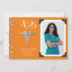 ¡Celebre al nuevo médico graduado de la facultad de medicina con este anuncio de graduación con caduceo médico plateado y naranja! ¡Elegante con un borde de foto vintage y acentos de confeti plateado! ¡Perfecto para cualquier persona que se gradúe como md o do con doctorado!