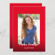 Esta plantilla moderna de anuncio de graduación minimalista roja y blanca presenta un guión de caligrafía y una foto en la parte frontal de la tarjeta. Una foto adicional en la parte trasera más texto fácil de cambiar para hacerlo tuyo.