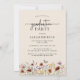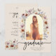 Anuncio de graduación floral y invitación a fiesta en la parte posterior. Este anuncio de graduación elegante y con estilo presenta hermosas flores silvestres pintadas a mano con acuarela dispuestas como un hermoso ramo y letra de caligrafía elegante. La parte posterior incluye una invitación a la fiesta de graduación. Encuentre productos coincidentes en la Colección de Graduación de Flores Silvestres Boho.