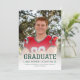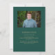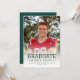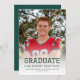 Anuncio de graduación con fotos personalizadas en la parte delantera y trasera. La palabra "Graduado" aparece en tipografía verde negrita con un aspecto deportivo ideal para el estudiante atleta, con el nombre del graduado, escuela y año de graduación debajo en fuente sans serif. La parte trasera presenta una foto horizontal, con espacio para detalles sobre el logro y planes futuros de su graduado en texto dorado sobre fondo verde. Una buena opción para la graduación de la escuela secundaria o universitaria.