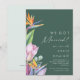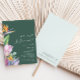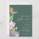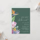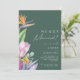 Este colorido anuncio de elopement tropical verde es perfecto para su moderna boda boho de destino verde, púrpura y melocotón. El diseño cuenta con un elegante ramo de clásica vegetación y flores de acuarela de playa, incluyendo eucalipto verde salvia, protea roja y malva, hibisco rosa claro, ave del paraíso naranja y azul, y hoja de palma verde oscuro. El diseño es ideal para una boda de viaje simple, creativa y única en primavera, verano, otoño o invierno. Por favor, busque otros artículos de papelería de boda que coincidan o coordinen en el resto de la colección.