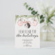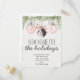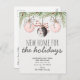 Comunica a familiares y amigos y deséales felices fiestas en la misma tarjeta con nuestra tarjeta postal "Hogar nuevo para las fiestas". El diseño presenta algunas ramas de árbol de Navidad y adornos colgantes con lazos elegantes. Personaliza con tu información al frente y atrás.