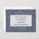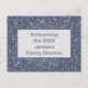 Las reuniones familiares son momentos perfectos para reunirse, intercambiar historias de acontecimientos en el último año y hacer nuevos recuerdos. Esta invitación de invitación es una manera barata de hacer que todos sepan su información de eventos. El fondo está decorado con mosaicos de colores azules y grises. Personalice rápidamente con el año y el nombre de su familia en la parte delantera y la información de su evento en la parte posterior. Nuestra colección de reuniones familiares está creciendo constantemente. Si estás buscando algo que no puedas encontrar, contacta conmigo y puedo personalizar algo especial para tu evento.