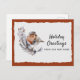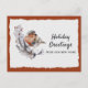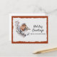 Un bonito ladrón de invierno de color gris y roya se sienta sobre una rama de hojas blancas y verdes contra un fondo de papel blanco enrollado y dorado nevado. El diseño se basa en un cálido color de roya procedente de las plumas del pájaro. El texto de ejemplo frente a nuestra nueva tarjeta postal de dirección de vacaciones dice "Saludos de vacaciones desde nuestra nueva casa". Este texto y todo el texto de la parte posterior de la tarjeta se pueden revisar fácilmente -o borrar para escribir a mano- a través de la plantilla de personalización.
