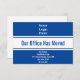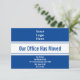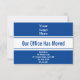 En la parte superior, hay una imagen de visualización que puede reemplazar con el logotipo de su empresa. En el centro, hay texto de visualización azul profundo para un mensaje personalizado (mostrado: Nuestra Oficina se ha Mudado). En la parte inferior, hay líneas de texto de visualización que puede editar para compartir la nueva dirección. La tarjeta es azul profundo y blanca.
