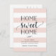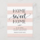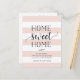 Los anuncios de mudanza encantadores y modernos les hacen saber a amigos y familiares sobre su nuevo hogar dulce hogar. El diseño presenta un fondo sutil rayado en rosa sonrosado y blanco, con "hogar dulce hogar" en escritura suave negra y tipografía de bloque. Utilice los campos de la plantilla para agregar su introducción personalizada, nueva dirección y nombres. La información se repite en el reverso con espacio para la dirección del destinatario.